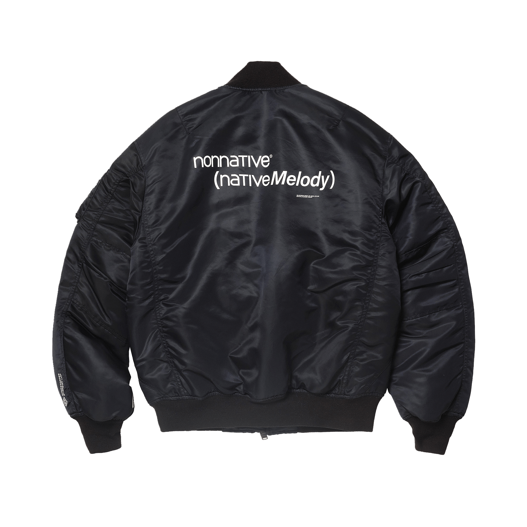 nonnative TROOPER BLOUSONをベースにシルエットをアレンジし ディティールをブラックで統一。背面にグラフィック、左袖内側にはFRGMTのサンダーロゴ、左胸には同色でAPロゴをプリントした特別仕様。機能面では身頃に GORE-TEX WINDSTOPPER®をライニングし 中綿には THINSULATEを採用。優れた防風性と断熱性を実現している。